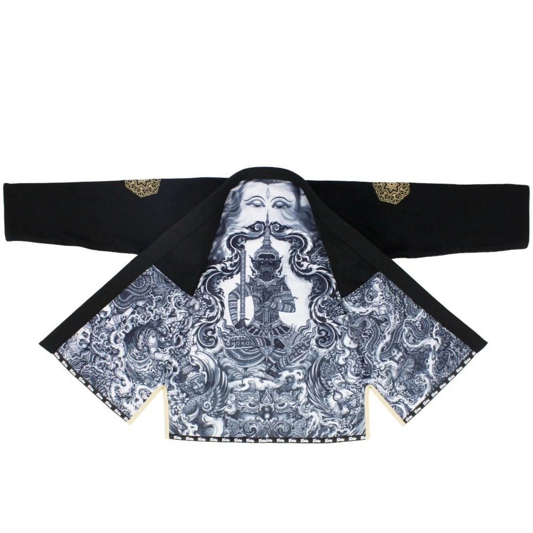 In addition to the resistant and light properties of the fabric, the unique design of this battle set is acrylic improvisation masterpiece of Thai design by a renowned artist and has taken over one year of time to create this piece of art in order that it can also show the beautiful lining design. This Thai artwork exhibits a special Thai pattern with a unique character of the artist and is transferred to the Coolmax fabric engineered with special technology to release moisture and accelerate drying. This type of polyester is a feature used to produce the latest sportswear. The details of Thai picture design show the great battle of the Treeburam War, highlighting the Treeburam giant who sits on the Rahu giant surrounded by giants and angels that are battling. When folded, the hidden Shiva’s eyes will emerge from inside the neckline.